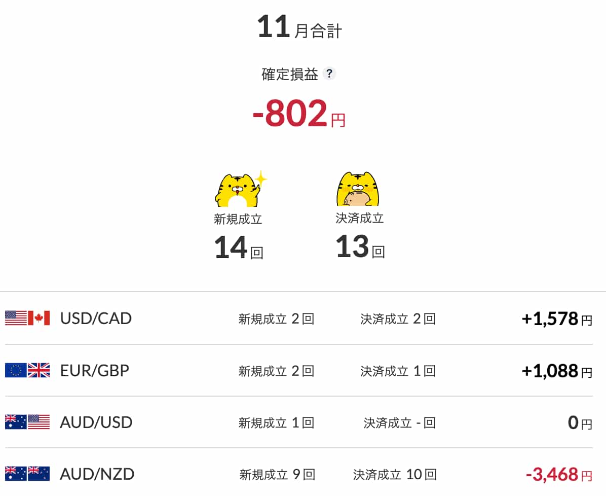 10月と比べると、取引回数は多少増加しますが、引き続き物足りない感じです。
